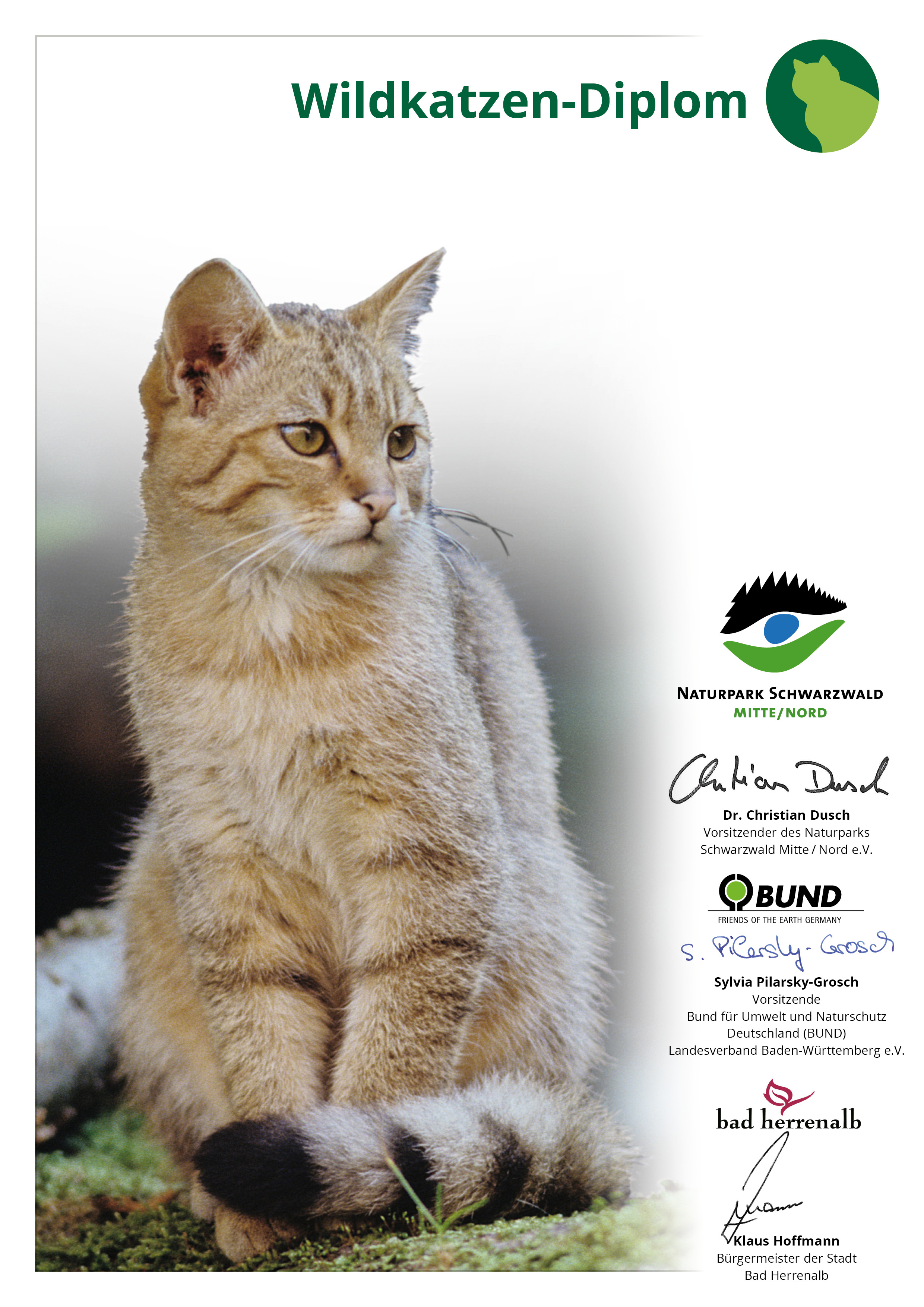 Hast Du auf dem Wildkatzen-Walderlebnispfad gut aufgepasst und alle Fragen richtig beantwortet? Dann trage hier das Lösungswort sowie Deinen Vor- und Nachname ein und Du erhältst Dein persönliches Wildkatzen-Diplom als PDF-Datei zum Ausdrucken.